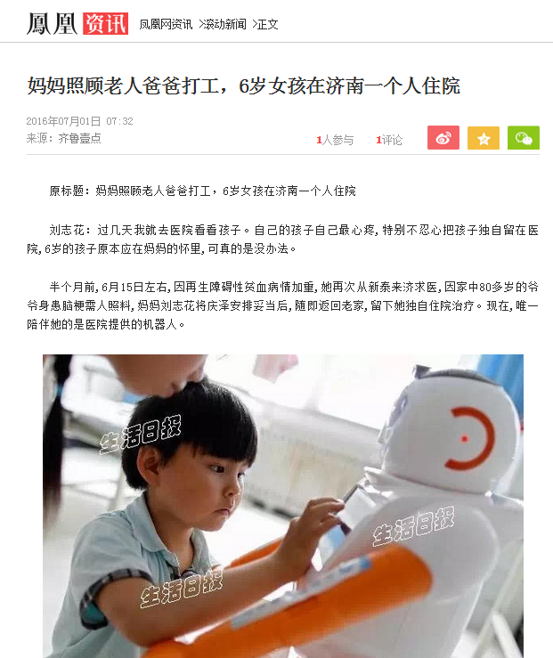 申庆泽,一个只有六岁的小女孩,因为患有再生障碍性贫血必须住院治疗,可是由于家庭困难,为了她的治疗费用爸爸必须外出打工,妈妈在老家一边打工一边照顾年迈病重的爷爷奶奶。医院带来的“机器人旺仔”成为唯一陪伴她的家人,和她一起唱歌、跳舞、做游戏。此事一经报道,各大媒体纷纷转载,希望能够帮助小庆泽筹得善款,帮助她尽早恢复健康。